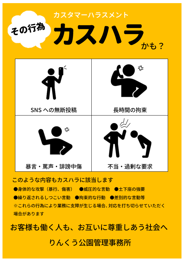 ●SNSへの無断投稿●長時間の拘束●暴言・罵声・誹謗中傷●不当・過剰な要求●身体的な攻撃(暴行、傷害)●威圧的な言動●土下座の強要●繰り返しされるしつこい言動●拘束的な行動●差別的な言動等※これらの行為により業務に支障が生じる場合、対応を打ち切らせていただく場合があります